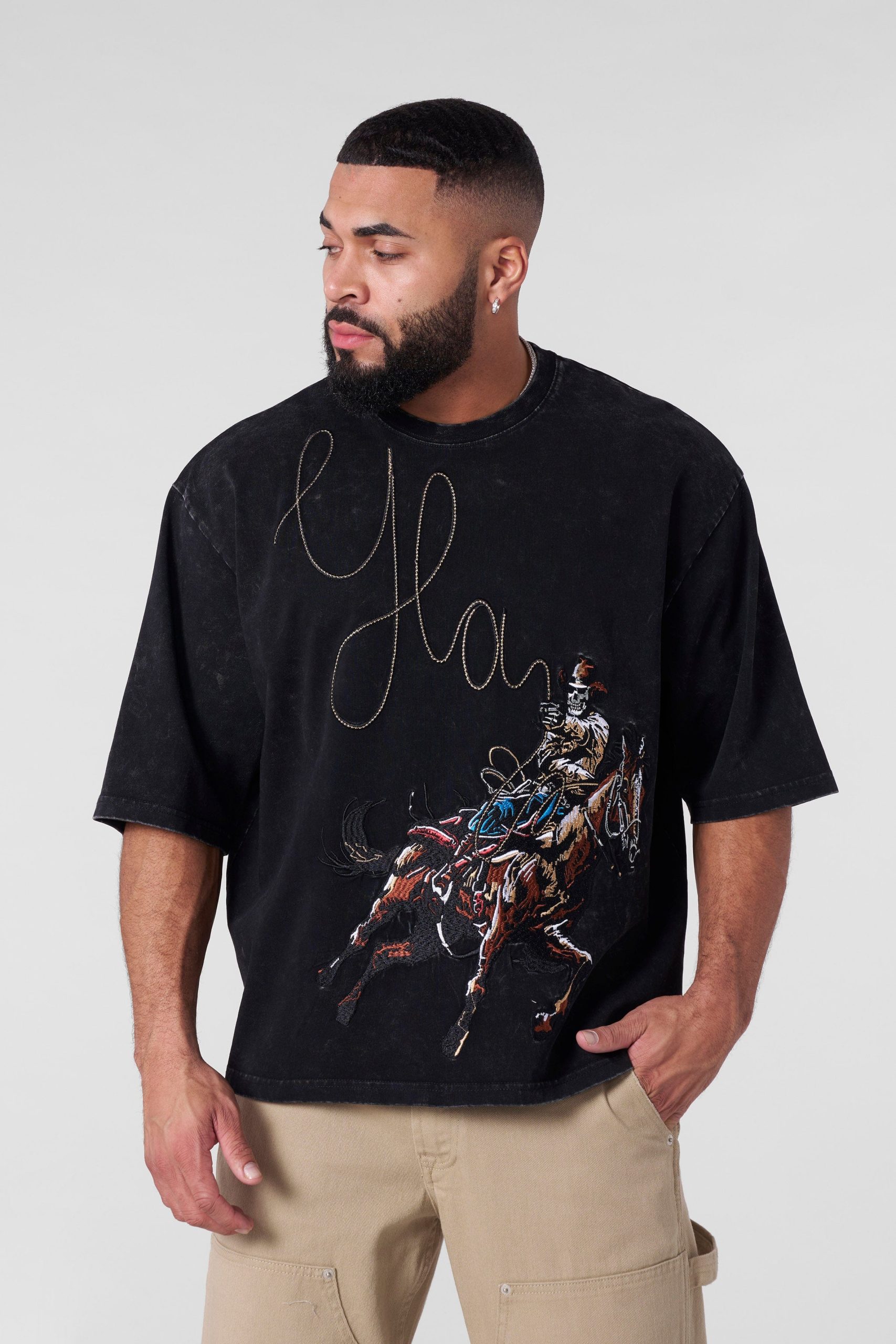 DESIGN: Featuring an intricately embroidered graphic of a cowboy in action, every detail is stitched with precision, bringing the design to life. The tee is washed inside out, creating a unique contrast effect along the sleeves and hem for a vintage-inspired highlight. With a rugged yet refined aesthetic, this tee is the perfect blend of heritage and modern streetwear.